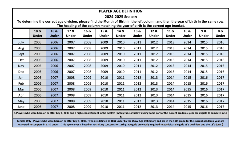 Please reference the attached USAV Age Chart to determine your correct age definition, as it differs from your “true age”, in most cases